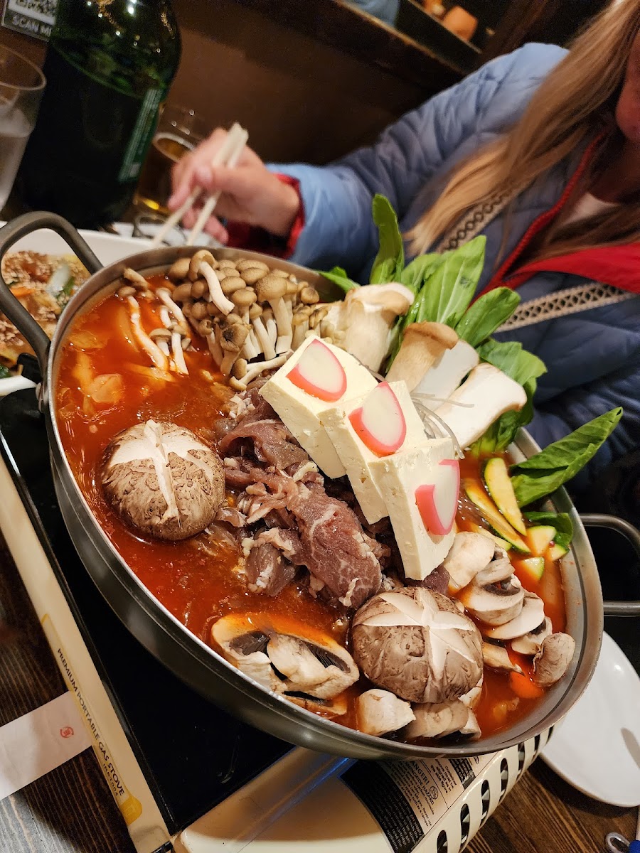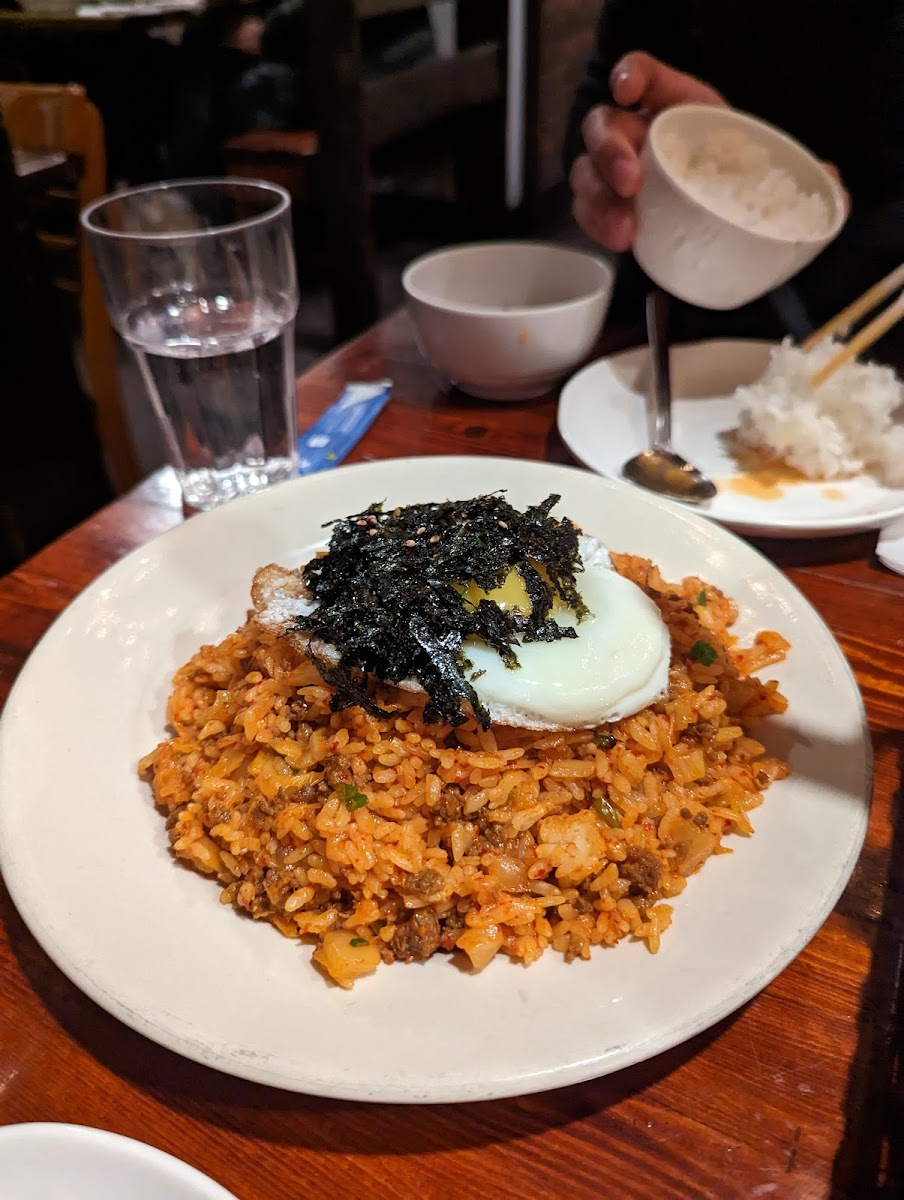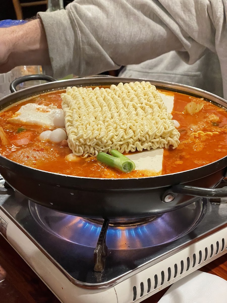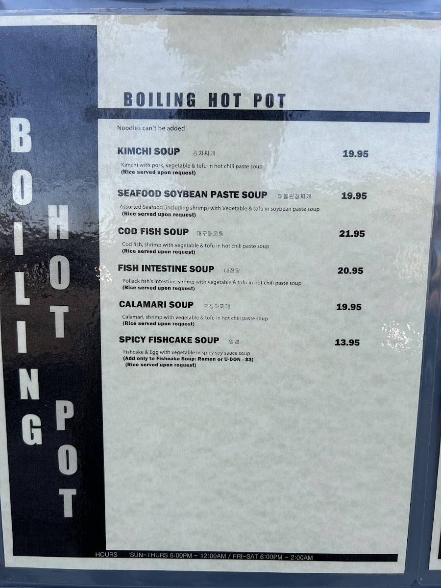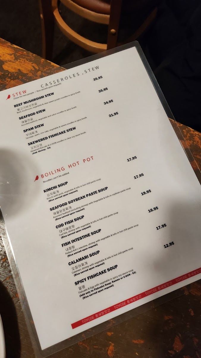 Toyose specializes in comforting Korean cuisine with a wide variety of dishes that cater to both adventurous palates and those seeking familiar flavors. Begin your feast with the Kimchi Soup (김치찌개), a hearty blend of tangy kimchi, tender pork, vegetables, and velvety tofu, simmered to perfection in spicy chili paste. If seafood is your preference, don’t miss the Calamari Soup (오징어찌개) bursting with the flavors of fresh calamari and shrimp, or the Boiling Hot Pot featuring fish intestines, shrimp, and tofu in a rich and fiery soup that is perfect for sharing (or indulging in solo!).